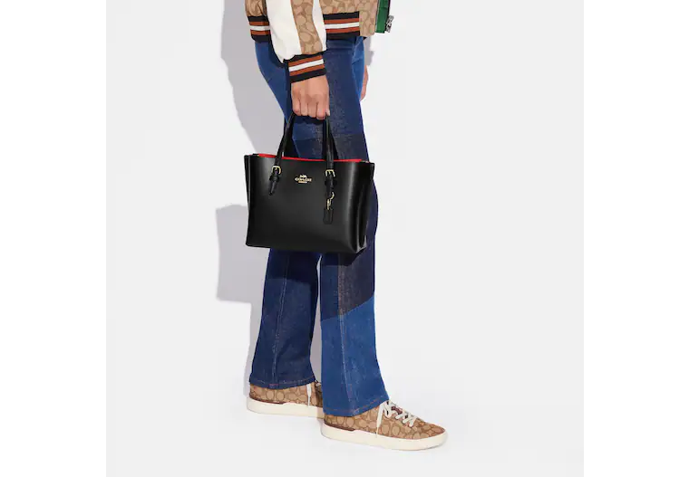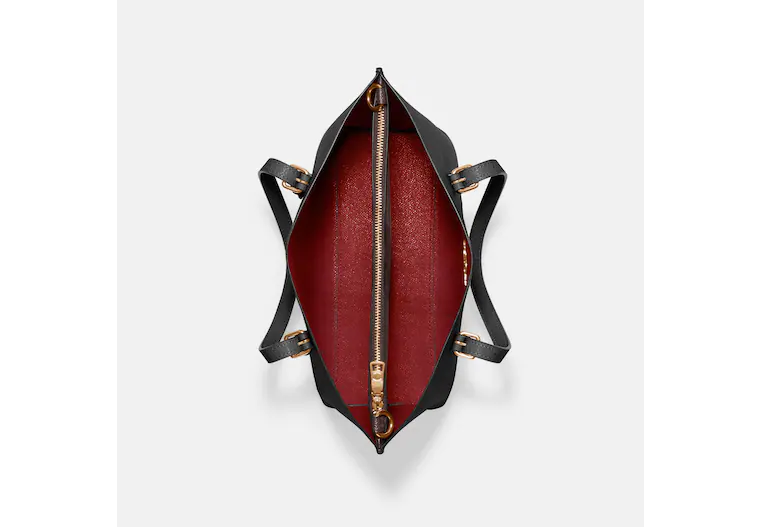 Cuero de doble cara Cierre con cremallera, forro de tela Compartimentos laterales abiertos Mangos con caída de 4 3/4" Correa desmontable con caída de 22" para llevar al hombro o cruzado 9 3/4" (largo) x 7 1/2" (alto) x 4 3/4" (ancho) N.º de estilo C4084