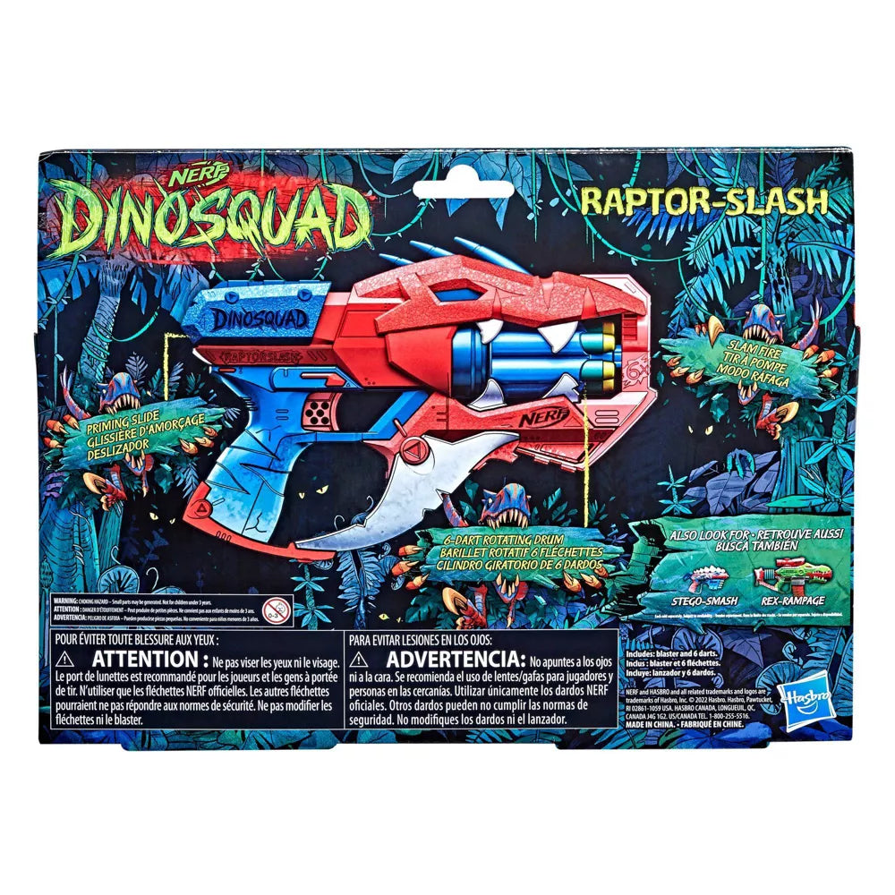 ¡Únete a los dinosaurios legendarios como miembro del DinoSquad de élite! ¡Aprovecha la extraordinaria fuerza de los mejores dinosaurios de todos y lánzate a increíbles aventuras! ¡Dispara a la diversión feroz con el lanzador Nerf DinoSquad Raptor-Slash! Cuenta con un impresionante diseño de dinosaurio, que captura el aspecto de un dinosaurio Velociraptor. El lanzador cuenta con un tambor giratorio de 6 dardos para que puedas lanzar 6 dardos seguidos. ¡El blaster está diseñado para que los dardos salgan disparados de la boca llena de dientes del raptor! Dispara 1 dardo a la vez, o dispara los 6 dardos rápidamente. Cargue el tambor, mueva la corredera de cebado hacia adelante y hacia atrás y apriete el gatillo para liberar 1 dardo. Vierta la potencia de fuego con la acción de slam-fire: mantenga presionado el gatillo y siga moviendo la corredera hacia adelante y hacia atrás para liberar los 6 dardos rápidamente. Incluye 6 dardos de espuma Nerf Elite oficiales que son ideales para aventuras al aire libre y bajo techo. Se recomiendan gafas (no incluidas). No requiere pilas.