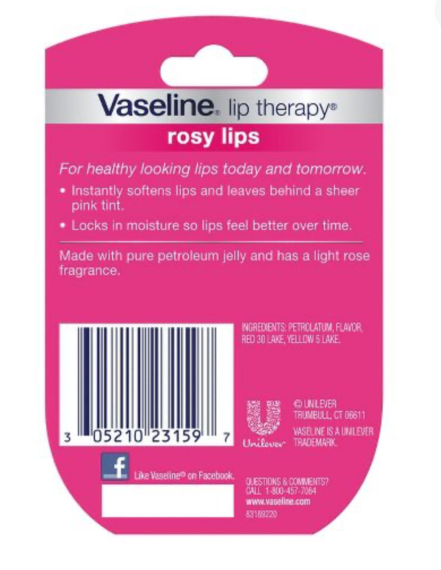 Está clínicamente probado que el bálsamo labial Vaseline Lip Therapy Lip Balm Mini Rosy ayuda a curar los labios secos. Las fórmulas no pegajosas de los mini bálsamos labiales Vaseline son tentadoramente suaves y se funden en los labios. Vaseline Lip Therapy Rosy Mini viene en un empaque icónico que cabe perfectamente en tu bolsillo o bolso, para que puedas hidratarte mientras viajas. Vaseline for Lips es el humectante labial perfecto. Con su fórmula original, Vaseline Lip Therapy es un bálsamo labial en el que puede confiar que proporciona un alivio duradero de la sequedad. Este producto esencial de todos los días para unos labios de aspecto saludable está elaborado con vaselina pura, como todos los productos para el cuidado de los labios con vaselina. Vaseline Jelly es la gelatina maravillosa original que ha ayudado a curar la piel seca desde 1870, y ahora puedes obtener todos sus beneficios en un producto de bálsamo labial diseñado exclusivamente para labios. La capa protectora superior de piel de los labios es más delgada que la del resto del cuerpo, por lo que necesita un bálsamo labial que proporcione una hidratación duradera. Estas fórmulas ayudan a favorecer la recuperación natural de los labios secos al retener la humedad. Perfecto para llevar. Los elementos pueden ser duros para tus labios, por lo que es esencial mantenerlos hidratados. Vaseline Lip Therapy Lip Balm Mini Rosy es excelente para proteger contra la sequedad causada por el clima, por lo que puedes estar seguro de que tus labios están listos para enfrentar el aire libre.